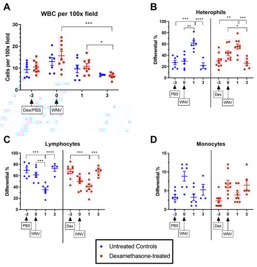 Hematological profile in mock- and dexamethasone-treated, WNV-infected rabbits on days -3 to 3 post-infection (p.i.). (A) Total number of white blood cells (WBC) in a 100x field, (B) Percentage heterophils, (C) Percentage lymphocytes, (D) Percentage monocytes. Statistical significance was determined by two-way analysis of variance (ANOVA). *, p = 0.01–0.05; **, p = 0.001–0.01; ***, p = 0.0001–0.001; ****, p < 0.0001. Each data point represents one rabbit in each group. The error bars represent the standard error of the mean and the middle bar represents the mean.