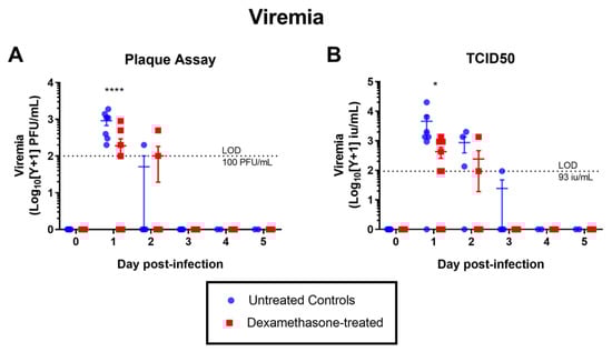 Level of viremia in untreated and dexamethasone pre-treated rabbits challenged with 105 TCID50 of WNV by injection in the left footpad. Virus loads in serum were measured by (A) plaque assay and (B) TCID50. LOD = limit of detection. Statistical significance was determined by two-way ANOVA. *, p = 0.01–0.05; **, p = 0.001–0.01; ***, p = 0.0001–0.001; ****, p < 0.0001. Each point represents the viremic titer of each of the rabbits in each group. The error bars represent the standard error of the mean and the middle bar represents the mean. Note that titers below the LOD are represented as zero.