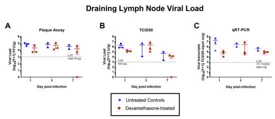 Viral load in the left popliteal lymph node (draining the footpad injection site) in untreated and dexamethasone pre-treated rabbits, measured by three different approaches: (A) plaque assay, (B) TCID50 assay, (C). qRT-PCR. LOD = limit of detection. No statistical significance was detected when groups were compared by two-way ANOVA. Each point represents the viral load of each of the rabbits in each group. The error bars represent the standard error of the mean and the middle bar represents the mean. Note that titers below the LOD are represented as zero.