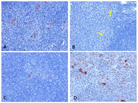 Immunohistochemical detection of WNV antigen (NS1; red cells) in left popliteal lymph node of (A) non-treated rabbit day 1 p.i. (score of +++), (B) dexamethasone-treated rabbit day 1 p.i. (yellow arrows point to rare, scattered NS1-positive cells; score of +), (C) non-treated rabbit day 3 p.i. (score of +), (D) dexamethasone-treated rabbit day 3 p.i. (score of ++). Original magnification 200×.