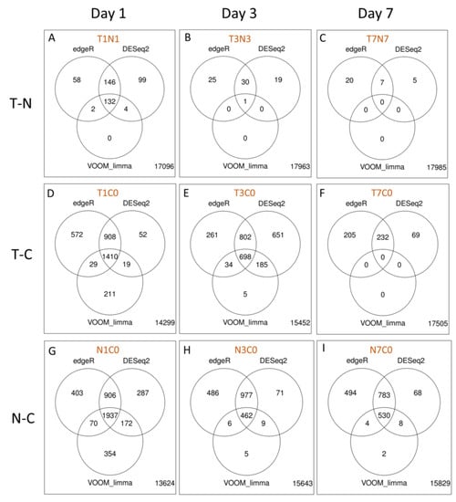 Pairwise comparisons for differential gene expression analyses using edgeR, DESeq2 and Voom-limma. (A) T1N1, (B) T3N3, (C) T7N7, (D) T1C0, (E) T3C0, (F) T7C0, (G) N1C0, (H) N3C0, and (I) N7C0. The days in the column headings refer to the day p.i. The numbers within circles represent the number of DEGs that were common (intersects) between each of the R package analyses or unique to each of the analyses (non-overlapping regions). The number external to the three circles represents the number of genes that were not differentially expressed. Each of the comparisons is denoted by a code (in brown) where the alphabets represent the treatment/infected status, and the number represents the day post-infection. T, dexamethasone treated WNV-infect groups; N, mock-treated WNV-infected groups; C, untreated uninfected group.
