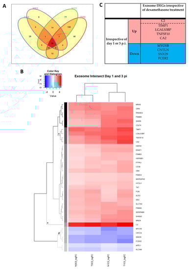 DEGs associated with the GO term “extracellular exosome” on day 1 and 3 p.i. (A) Venn diagram showing the overlapping DEGs between the T1C0, T3C0, N1C0 and N3C0 comparisons, as well as the unique DEGs. (B) Common DEGs are then analyzed for top up- and downregulated DEGs by hierarchical clustering. The grey scale dendrogram branches and the corresponding sidebar in each heatmap represent the different clusters. Clusters with symbols * and # indicate top up- and downregulated clusters, respectively, summarized in Table 4, Table 5 and Table 6. The blue-red scalebar in the top left corner of each heatmap corresponds to the color scale of the heatmap, indicating the logFC for each gene. The light blue histograms within these scalebars indicate the frequency of genes at each level of logFC. (C) Top clusters of exosome DEGs on day 1 and 3 p.i. (summary of Figure 7B).