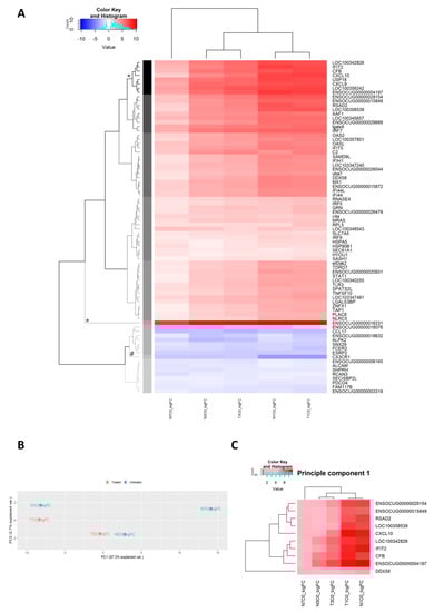 The subsetted matrix containing 78 DEGs used for hierarchical clustering was also used for PCA, which aimed at identifying DEGs that have the largest effect in explaining the variation of logFC across the different comparisons, N1C0, N3C0, N7CO, T1C0 and T3C0. This allowed identification of DEGs that were the “most different” across the comparisons. The PCA plot in Figure 8B shows that the different comparisons cluster most closely within their corresponding time p.i., with the greatest degree of separation between treatment versus mock-treatment on day 1 p.i. Again, similar to the unsupervised hierarchical clustering, some DEGs already highlighted as important from GO analyses were also present in the top 10 DEGs of the first principal component (PC1), which explained 97.3% of the variation of logFC in the data matrix (Figure 8C and Table 7). These genes included CXCL10, RSAD2 and DDX58 (Table 7). Common to the top clusters from the unsupervised hierarchical clustering, IFIT2, CFB, IFIT1-like protein (LOC100342826) and the novel gene ENSOCUG00000004197 (human orthologue of IFIT1B) were also identified as some of the top ten contributors to the first principal component (Table 7). Unreported in the analyses prior to this, guanylate-binding protein 1 (GBP1; LOC100358539), IFIT3 (ENSOCUG00000029154) and an additional novel gene (ENSOCUG00000015849; Human orthologue: HERC6 [ENSG00000138642]) were identified as important contributing genes to principal component 1 (Table 7).