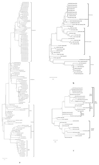 Phylogenic trees created with the glycoprotein (G) (a), nucleocapsid protein (N) (b), and nonvirion (NV) (c) gene sequences. The scale axis indicates substitutions per site and the tree was constructed using maximum likelihood method of MEGA 10.0.