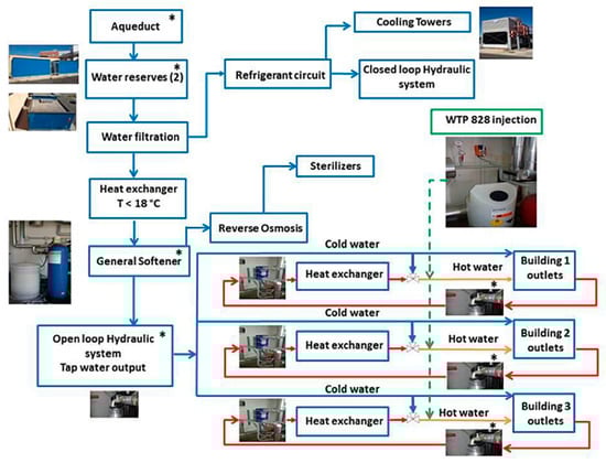 All buildings are supplied with the same municipal water aqueduct, which brings water from the Ridracoli dam located 53 km from Cotignola. The water is first collected in two 30 m3 water reservoirs outside the buildings. After filtration through a 150 µm pore size filter, water is fed into two pipelines: one to the cooling towers and refrigerant circuit (a closed loop hydraulic system) and the other to the water treatment station (an open loop hydraulic system). A plan of the water distribution network is shown in Figure 1.