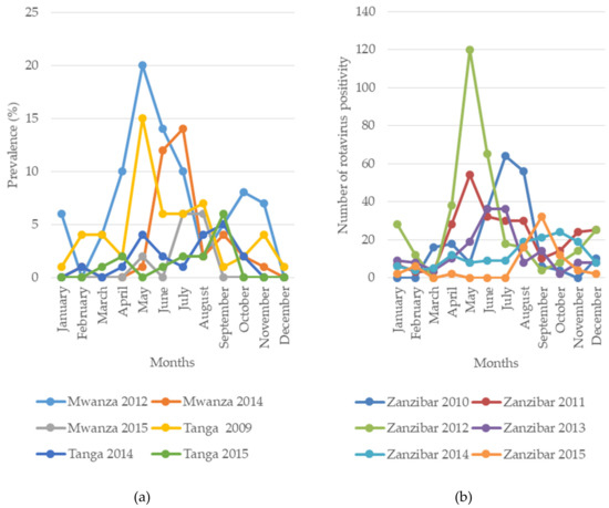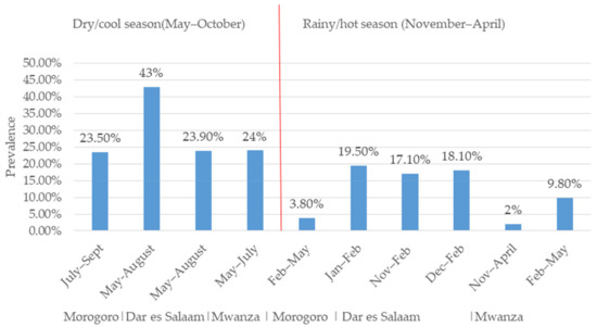 The difference in RVA prevalence between studies may be explained by seasonal variation. We observed a higher prevalence of RVA in studies conducted during the cool/dry season than those conducted in the hot/rainy season (Figure 2). These findings suggest that the rotavirus prevalence in the tropics is higher during the cool/dry season compared to the hot/rainy season [51]. For example, the prevalence of RVA based on the latex agglutination test (LAT) for the detection of the RVA antigen from children’s faeces in Morogoro was 23.5% (82/348) in the dry/cool season (July–September) and 3.8% (4/103) in the rainy/hot season (February–May) (Figure 2). A similar finding was observed in Dar es Salaam, where a higher prevalence of RVA was found in studies conducted in the cool/dry season (43%, n = 99, May and August) [41] than in the hot/rainy season (19.5%, n = 89, January–February) based on the LAT [39] (Figure 2). In the same region, based on EIA, the prevalence of RVA was found to be higher in the dry/cool season (23.9%, May–August) [31] than in the rainy/hot season (17.1%, November–February [31]; 18.1%, n = 270, December–February [40]) (Figure 2). In Mwanza, based on EIA, a higher prevalence (29%, n = 197) of RVA was observed in the dry/cool season (May–July) and a lower prevalence (0–2%, n = 197) was observed in the rainy/hot season (November–April) [37]. In same region, the rainy/hot season (February–May) was shown to have a lower prevalence of RVA 9.8% (n = 805) based on EIA [43]. However, in the same Mwanza region, a higher prevalence of 50.2% was observed in the rainy season (November–April) compared with 44.6% in the dry season (May–October), although the difference was not statistically significant [36]. In Tanga, a higher prevalence was observed in the dry/cool season (May and October) compared with the rainy/hot season (November–April) in 2009, 2014, and 2015 both before and after vaccine introduction, even though no seasonal variation was observed in 2011 [37]. Generally, the prevalence of RVA seems to be higher during the dry/cool season in the study regions (Figure 2).