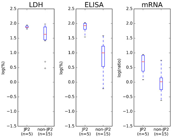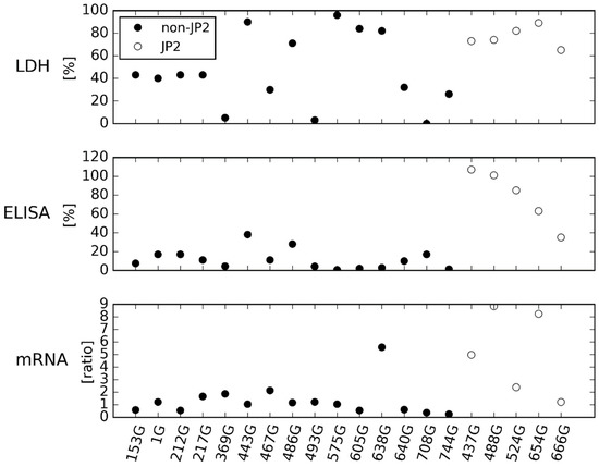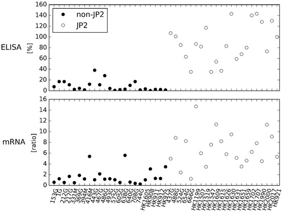 By visual inspection of Figure 1, the ELISA showed the same division of JP2 and non-JP2 genotype strains of A. actinomycetemcomitans as demonstrated by the Western blotting (Figure S1). In Figure 1 and Figure 2, the cell lysis assay (LDH) characterizes the leukotoxicity of the strains, and the results are from the publication by Höglund Åberg and coworkers (2014) [20]. The results are given as a percentage of total lysis of THP-1 cells by Triton X. The ELISA determines the leukotoxic production of the A. actinomycetemcomitans strains as a percentage of the reference A. actinomycetemcomitans strain HK921, and results are the mean of two separate runs. The mRNA expression assay determines the leukotoxin expression of A. actinomycetemcomitans strains as a ratio to adk and pgi, and the results are the mean of three separate runs.