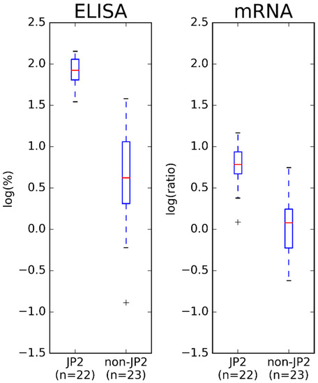 2.2. Comparison of Results Obtained by ELISA and mRNA Expression Assay