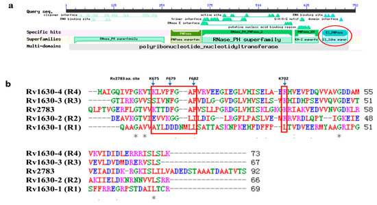 Rv2783 domain analysis and alignment with RpsA domains. (a) Rv2783 domain analysis shows the S1_PNPase domain (in the red circle) at its C-terminus, originally identified in ribosomal protein S1 (Rv1630) for RNA binding; (b) alignment of Rv2783 with four Rv1630 domains. Rv1630-1 to Rv1630-4 represent the four homologous RNA-binding domains (R1–R4) in RpsA. Both the Rv2783 S1_domain and the Rv1630-4 domain carry the KXXXFXXF motif (in the left red rectangle), which has been reported to comprise the main residues for POA and transfer-messenger RNA (tmRNA) binding. The mutant site of K702Q in Rv2783 is also located in the S1_domain (in the right red rectangle).