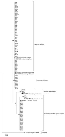 The obtained sequences were edited with the BioEdit software v.7.0.5.3 developed by Tom Hall (https://www.filemoro.com/bioedit-free-download/) and an analysis of sequence similarity was conducted with previously-reported EF1-α and RPB2 sequences from Fusarium MLST (http://www.wi.knaw.nl/Fusarium/Biolomics.aspx) and FUSARIUM-ID (http://isolate.fusariumdb.org/guide.php) database []. All obtained and reference sequences from NCBI were aligned using Clustal X 1.83 developed by SGI (http://www.sgi.com/industries/sciences/chembio/resources/clustalw/parallel_clustalw.html). A phylogenetic tree was constructed by MEGA 7.0.26 using the maximum-likelihood method based on the Tamura–Nei model []. One thousand bootstrap replicates were used for clade support, and alignment gaps were removed. Prestigious sequence data were submitted in the alignment in TreeBASE (www.treebase.org) and in GenBank.
