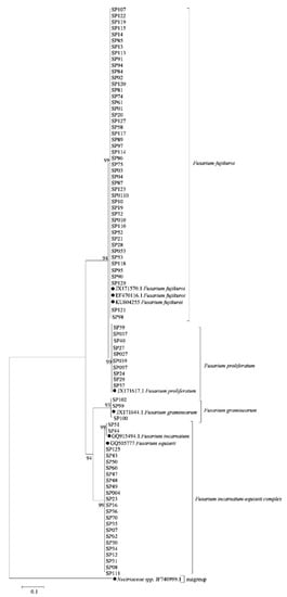 Phylogenetic tree of Fusarium species associated with soybean pods based on the EF1- α gene. A phylogenetic tree of EF1-α nucleotide sequences was constructed using the Maximum-likelihood method in MEGA 7.0.26 (Pennsylvania State University). Bootstrap support values were ≥50% from 1000 replications, which are shown at the nodes. Nectriaceae spp. (JF740999.1) was selected as an outgroup. The EF1-α sequences of referred Fusarium isolates were obtained from GenBank and are indicated by a solid dark diamond.