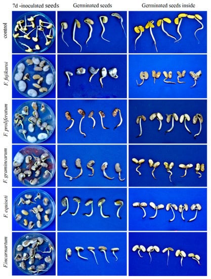 Koch’s postulate was used to test the pathogenicity of the identified Fusarium species by inoculation of spore suspension. The impact of three representative isolates of Fusarium species (F., F. proliferatum, F. equiseti, and F. graminearum) and two isolates of F. incarnatum was checked on asymptomatic seeds of soybean cultivar “Nandou12”. The seed soaking method was used according to [] with minor modifications in detail. A spore suspension was prepared by transferring about five mycelium disks of Fusarium isolates into 20 mL of CMC or PDA medium and incubating at 150 r·min−1 and 25 °C on an orbital shaker for 7 days. The final concentration of 1 × 105 spore mL−1 was adjusted and used for inoculation. Soybean seeds were surface sterilized with 1% sodium hypochlorite solution for 1 min, rinsed three times in sterile distilled water, and air-dried on sterile filter paper under aseptic conditions. For each isolate, three plates were prepared with 15 seeds each, and three independent replicates were conducted. Sterilized seeds were dipped in the spore suspension for 5 min, while seeds dipped in sterile distilled water were used as a negative control and incubated at 25 ± 2 °C in the dark with 70% relative humidity. After seven days of inoculation, the symptoms and disease incidence were recorded. For the disease severity index (DSI), seeds were assigned a disease severity grade [] with minor modifications: 0 = healthy seeds germination, 1 = delayed growth with negligible or no discoloration, 2 = germination with isolated lesions, 3 = developed with the merged lesion, and 4 = colonized seeds with no germination. The DSI was calculated according to the formula below. The percentage of the mycelium-covering area (PMC) on the seed surface was also evaluated. Additionally, the germination rate, seed weight and root length of the soybeans were documented. For statistical analysis, Dunnett’s test was used by SPSS to determine significant differences.