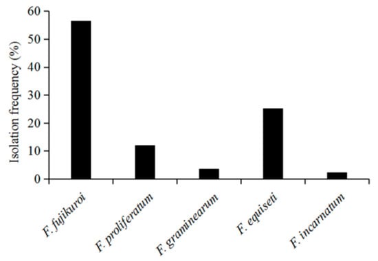 As shown in Figure 4, the isolation frequency of each identified Fusarium species associated with the intercropped soybean pods was different. Among them, F. fujikuroi and F. equiseti had the highest isolation frequencies, i.e., 56.6% and 25.3%, respectively, followed by F. proliferatum with 12%, whereas F. graminearum and F. incarnatum had the lowest among the identified Fusarium species. Thus, F. fujikuroi was found to be the dominant Fusarium species associated with intercropped soybean pod decay in Sichuan Province, China.