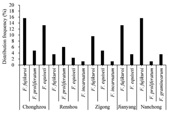 Distribution frequency of Fusarium species in different intercropped soybean-producing areas of Sichuan Province, China. The percentage of each species of Fusarium from five intercropped soybean-growing areas, i.e., Chongzhou, Renshou, Nanchong, Jianyang, and Zigong in Sichuan Province, China, was calculated to evaluate the diversity of the Fusarium population.