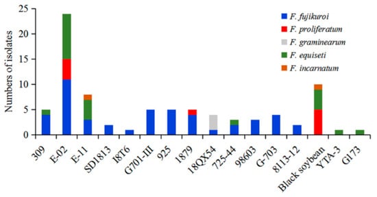 In the present study, a total of 83 Fusarium isolates were recovered from 16 different soybean varieties (Table 1 and Figure 5). Fusarium fujikuroi and F. equiseti were most aggressive to 81% (13/16 varieties) and 43% (7/16 varieties) of total varieties, respectively, followed by 18% F. proliferatum (3/16 varieties), 12% F. incarnatum (2/16 varieties), and 6% F. graminearum (1/16 varieties) (Figure 6). In our results, F. fujikuroi and F. equiseti were found to be the most aggressive to soybean E-02, followed by F. proliferatum. Interestingly, F. graminearum and F. incarnatum did not affect the variety of E-02 (Figure 6). Thus, our results showed some specific relationship of the specificity and aggressiveness of Fusarium species with different soybean varieties cultivated in Sichuan Province, China.