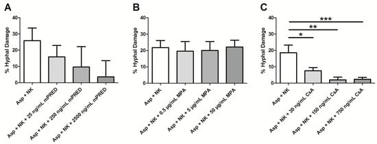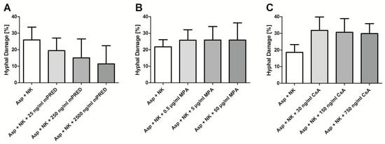 In order to analyze the impact of an immunosuppressive agent on the antifungal activity of NK cells, the difference of the measured hyphal damage mediated by NK cells and the immunosuppressive drug (Figure 1A–C) and the hyphal damage exhibited by the immunosuppressive drug alone (Supplementary Figure S1) has to be calculated. In this analysis, CsA significantly decreased the effect of human NK cells against A. fumigatus hyphae (mean ± SEM: NK cells alone 18.6% ± 4.7% and 2.4% ± 1.2% at the highest concentration of 750 ng/mL of CsA; p = 0.041; Figure 2C). As MPA and mPRED alone did not exhibit major damage of A. fumigatus hyphae (Supplementary Figure S1), no significant difference between the measured and calculated hyphal damage by NK cells in the presence or absence of mPRED and MPA, respectively, was seen (Figure 2A,B).