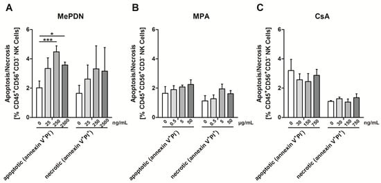 Compared to untreated controls, mPRED at higher concentrations significantly increased apoptosis of IL-2 stimulated human NK cells (mean ± SEM; mPRED at 0, 25, 250, and 2500 ng/mL, 2.0% ± 0.5%, 3.3% ± 0.7% (not significant), 4.5% ± 0.4% (p = 0.005) and 3.6% ± 0.2% (p = 0.014); Figure 3A). In contrast, MPA and CsA did not significantly alter the apoptosis and necrosis of NK cells (Figure 3B,C).