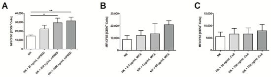 In addition, mPRED at higher concentrations significantly decreased cell proliferation of NK cells, indicated by significantly higher mean fluorescence intensity (MFI) of CFSE in the NK cell population after seven days (mean ± SEM: mPRED at 0, 25, 250, and 2500 ng/mL 14,627 ± 1171, 22,546 ± 4167 (not significant), 29,400 ± 5194 (p = 0.032), and 31,546 ± 4032 (p = 0.007), respectively; Figure 4A and Supplementary Figure S1). In contrast, MPA and CsA did not significantly inhibit proliferation (Figure 4B,C).