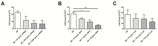 Only MPA at higher dosages significantly decreased the cell count of viable NK cells determined after seven days (mean ± SEM: control 10.3 × 105 ± 1.4 × 105, MPA at 0.5 µg/mL, 5 µg/mL and 50 µg/mL 6.9 × 105 ± 0.6 × 105 (not significant), 4.8 × 105 ± 1.4 × 105 (p = 0.0482), and 2.4 × 105 ± 0.5 × 105 (p = 0.0058), respectively (Figure 5B), whereas, the impact of mPRED and CsA on the cell count was not significant (Figure 5A,C).