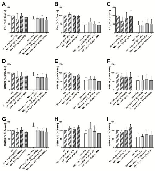 None of the immunosuppressive compounds tested had an impact on the levels of IFN-γ, GM-CSF and RANTES, respectively. This finding was independent of the concentration of the compound used and of the fact whether NK cells and the respective immunosuppressive compound were co-incubated with or without A. fumigatus. On the other hand, as previously reported, A. fumigatus alone up-regulates the production of IFN-γ, but reduces its release, which ultimately results in decreased extracellular levels [32]. The exact mechanism of this phenomenon has not been resolved to date. We focused on the assessment of IFN-γ, GM-CSF and RANTES as they play important roles in the immune modulation by NK cells, but we recognize the fact that the selection of other molecules could have revealed different results. However, similar to our data, 24 h incubation of IL-2 pre-stimulated human NK cells with MPA had minimal effects on the secretion of cytokine and chemokines, such as IFN-γ, IL-6, TNF-α, CXCL8, CCL2, CCL4 and CCL5 [27]. In contrast, co-incubation of NK cells with mPRED, MPA and CsA for at least five days significantly reduced the secretion of IFN-γ [28,33]. The differences might be explained by different pre-stimulation protocols as other groups used 100 U/mL IL-2 for pre-stimulation of NK cells, whereas, our experiments were performed with 1000 U/mL of IL-2. In this regard, the optimal pre-stimulation strategy is not clear to date, and therefore, it is not surprising that combinations of one or more cytokines, including IL-2, IL-12, IL-15, IL-18, and IL-21 have also been used at different dosages. In our study, we used a pre-stimulation protocol that has already been applied in the clinical setting by various groups [34,35,36]. As both the stimulation protocol of NK cells and the time of exposure of NK cells with the respective immunosuppressive drug are critical determinants for the immune response, future studies are warranted to optimize these conditions for each setting.