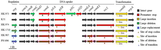 2.2. Natural Competence and Genomic Characteristics of Lineages