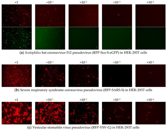 The infectivity of the generated pseudoviruses was determined by counting red fluorescent cells and also green fluorescent cells in the case of RFP-Sco-S-eGFP. The titers of the three pseudoviruses were calculated after the inoculation of serially tenfold-diluted pseudoviruses in HEK-293T cells (Figure 2). The average titers of RFP-Sco-S-eGFP, RFP-SARS-S, and RFP-VSV-G in HEK-293T cells were 5.4 × 104, 2.4 × 104, and 8 × 104 TCID50/mL (infectious dose infecting 50% of tissue culture), respectively. For the pseudoviruses carrying the luciferase gene, the average titers of FLuc-Sco-S-eGFP, FLuc-SARS-S, and FLuc-VSV-G in HEK-293T cells were 3 × 102, 1.5 × 103, and 1.2 × 105, respectively. The generated pseudoviruses were stored at −80 °C and virus titers began to decrease after 1 month of storage at −80 °C. Therefore, a fresh batch of pseudoviruses was prepared for pseudovirus entry assays performed for different batches of cells at different times.