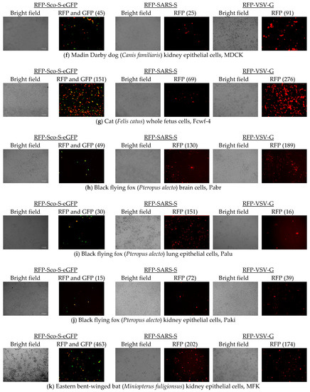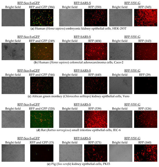 Cell entries of RFP-Sco-S-eGFP, RFP-SARS-S, and RFP-VSV-G were determined by counting red fluorescent cells and all tested cells were susceptible to the infection of the three pseudoviruses (Figure 5). At 48 hpi of the pseudovirus RFP-Sco-S-eGFP, more than 100 cells showing red fluorescence per field were observed in Vero (average 544 red fluorescent cells), MFK (463), 293T (384), IEC-6 (320), Caco-2 (249), and Fcwf-4 (151) cells and less than 50 cells showing red fluorescence per field were observed in Pabr (49), MDCK (45), Palu (30), Paki (15), and PK15 (15) cells. Cells infected with RFP-Sco-S-eGFP also showed green fluorescence from the expressed GFP fused to the S protein of Scotophilus bat CoV-512. At 48 hpi of the pseudovirus RFP-SARS-S, more than 100 cells showing red fluorescence per field were observed in IEC-6 (539), Vero (440), Caco-2 (404), 293T (350), MFK (202), PK15 (171), Palu (151), and Pabr (130) cells and less than 80 cells showing red fluorescence per field were observed in Paki (72), Fcwf-4 (69), and MDCK (25) cells. At 48 hpi of the pseudovirus RFP-VSV-G, more than 100 cells showing red fluorescence per field were observed in 293T (345), Fcwf-4 (276), Pabr (189), MFK (174), PK15 (160), Caco-2 (143), and IEC-6 (126) cells and less 100 cells showing red fluorescence per field were observed in MDCK (91), Paki (39), Vero (29), and Palu (16) cells.