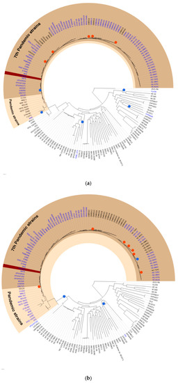 The hypothetical evolutionary history of the (a) VPI-1 and (b) VSP-1 genomic islands. The 171 selected strains were shown on the phylogeny tree. The pandemic strains and the seventh pandemic strains were shaded with colors. Blue dots were marked where the hypothetical insertion event occurred, and red dots were marked where the hypothetical deletion event occurred. GI containing strain were labeled with blue. The reference strain N16961 was marked with dark brown highlight.