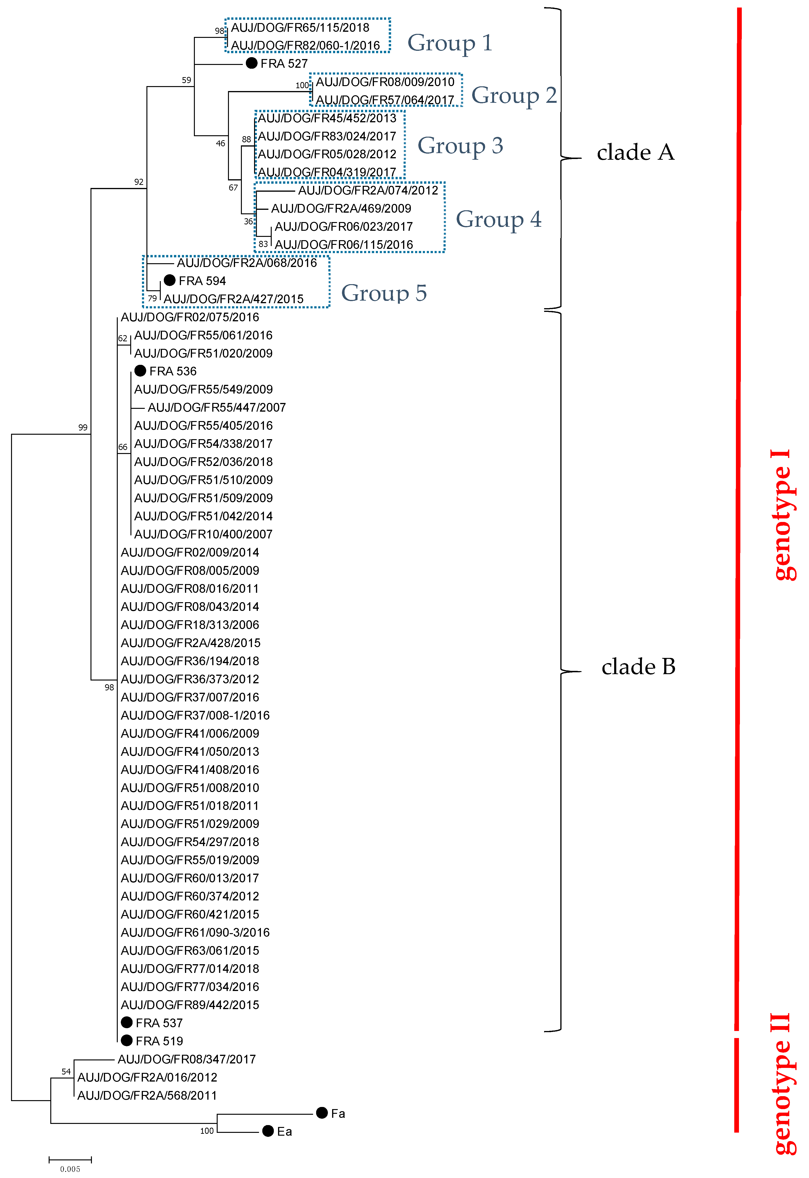 2.2. Geographical Distribution of PRV Strains Isolated from Dogs in France from 2006 to 2018