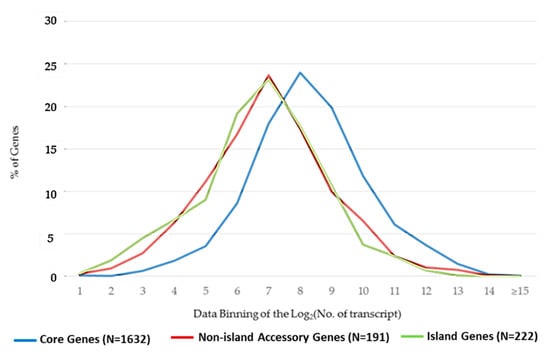 The combined expression levels of 4 experimental conditions for core, non-island accessory genes, and island genes are shown in Figure 1. The expression levels were statistically significantly different between core and non-island accessory genes or island genes in each of the tested conditions or in all conditions (the range of the p-values was 10−8 to 10−148 by Student’s t-test. See Supplementary Table S2 for detailed information). The mode of the expression of non-island accessory or island genes was 27 transcripts, while the mode of expression of the core genes was 28 transcripts. The patterns of gene expressions were similar between non-island accessory and island genes (Supplementary Table S2). Henceforth, as appropriate, some results focused on the comparison between core and island genes.
