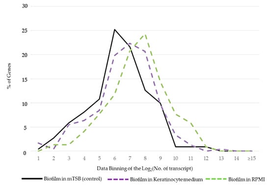 Figure 3 showed differentially expressed genes (both accessory and core genes) in keratinocytes medium and RPMI grouped according to the Cluster of Orthologous Group (COG) categories. There were more upregulated genes compared to those that were downregulated in both media. Keratinocytes medium had about 35% of the upregulated genes belong to COG S whose functions were still unknown. About 46% of the genes in COG V (defense mechanism) were upregulated, and about 31% of genes in COG Q (secondary metabolites biosynthesis, transport, and catabolism) were downregulated genes in RPMI. These might make good targets to determine genes and pathways involved in cellular responses to the stress of nutrient limitation.