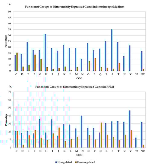 Cluster of Orthologous Groups (COG) functional categories of differentially expressed genes in keratinocyte medium (a) and RPMI (b). The y-axis is the percentage of differentially expressed genes. (C) Energy production and conversion, (D) cell cycle control, cell division, chromosome partitioning, (E) amino acid transport and metabolism, (F) nucleotide transport and metabolism, (G) carbohydrate transport and metabolism, (H) coenzyme transport and metabolism, (I) lipid transport and metabolism, (J) translation, ribosomal structure and biogenesis, (K) transcription, (L) replication, recombination and repair, (M) cell wall/membrane/envelope biogenesis, (N) cell motility, (O) posttranslational modification, protein turnover, chaperones, (P) inorganic ion transport and metabolism, (Q) secondary metabolites biosynthesis, transport and catabolism, (R) general function prediction only, (S) function unknown, (T) signal transduction mechanisms, (U) intracellular trafficking, secretion, and vesicular transport, (V) defense mechanism, (W) extracellular structure, (NC) not categorized.