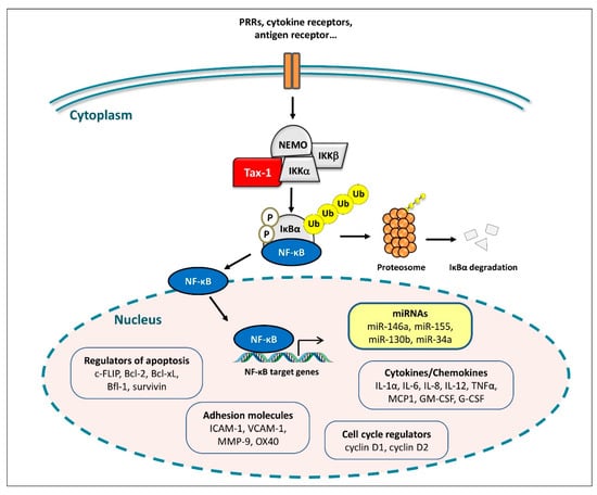 Persistent activation of NF-κB induced by Tax-1 in the early stages of HTLV-1 infection is considered a critical step for survival and proliferation of HTLV-1-infected T cells []. The NF-κB transcription factors regulate the expression of more than one hundred genes that participate in cell proliferation, inflammation, and innate immunity [,]. HTLV-1 Tax induces constitutive activation of NF-κB, causing aberrant expression of many target genes, including those coding for cytokines/chemokines, inflammatory proteins, adhesion molecules, cell cycle regulators, and apoptosis regulators (representative examples are listed in Table 1) [,,,,].
