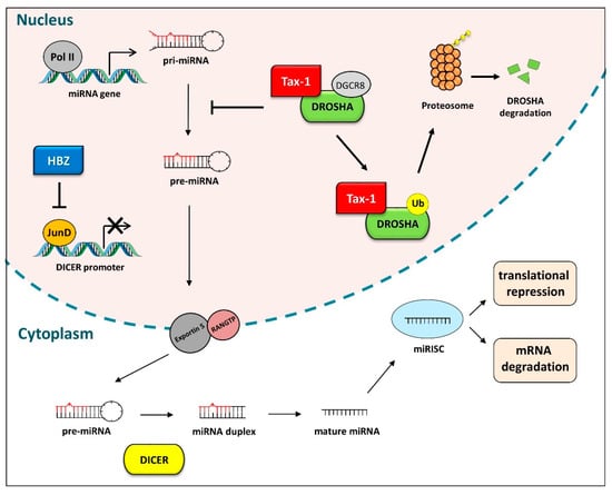 Tax-1 and HBZ interfere with miRNA processing. Within the nucleus, most miRNAs are synthesized as pri-miRNAs by RNA polymerase II and processed into pre-miRNAs by DROSHA/DGCR8-containing complexes. Pre-miRNAs are exported into the cytoplasm by Exportin 5, where they undergo an additional processing event by DICER, generating a miRNA duplex. The formation of the RNA-induced silencing complex (RISC) complex leads to repression of translation and/or degradation of specific target transcripts. Tax-1 deregulates this process by directly interacting with DROSHA and leading to its proteasomal degradation (the nuclear or cytoplasmic location of this process remains to be determined). HBZ reduces the expression of DICER by removing JunD from the binding sites located in the DICER gene promoter.