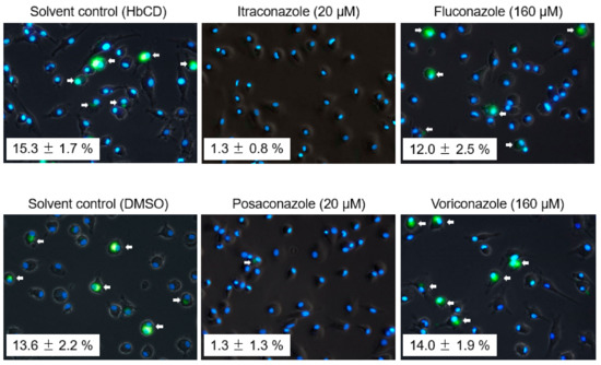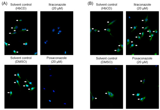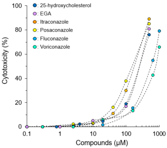 The 25-HC (cholesterol transport inhibitor), EGA (late endosome trafficking inhibitor), posaconazole, voriconazole, and fluconazole were purchased from Sigma Aldrich Japan (Tokyo, Japan). Itraconazole was purchased from Janssen Pharma-central K. K. (Tokyo, Japan). The 25-HC was dissolved in methanol. EGA, Posaconazole, voriconazole, and fluconazole were dissolved in dimethyl sulfoxide (DMSO). Itraconazole was dissolved in 40% (w/v) hydroxypropyl-beta-cyclodextrin (HbCD) solution. All compounds were adjusted to 10 mM with solvent, aliquoted, and stored at-30 °C until use. On the day of the experiments, these compounds were diluted to the desired concentrations in maintenance medium.