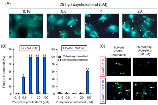 The effects of 25-hydroxycholesterol on feline coronavirus (FCoV) infection. (A) Accumulation of intracellular cholesterol in fcwf-4 cells pretreated with different concentrations of 25-hydroxycholesterol. The arrowheads point to the cells with accumulated intracellular cholesterol. (B) Plaque reduction in FCoV-infected fcwf-4 cells treated with different concentrations of 25-hydroxycholesterol. *, p < 0.05 vs. solvent control. **, p < 0.01 vs. each solvent control. Data represent four independent experiments. (C) Effects of 25-hydroxycholesterol on the viral protein. FCoV nucleocapsid (N) protein expression was evaluated by immunofluorescence assay (IFA). Nuclei were stained with 4′,6-diamidino-2-phenylindole (DAPI). The arrows point to the cells with expressing FCoV N protein.
