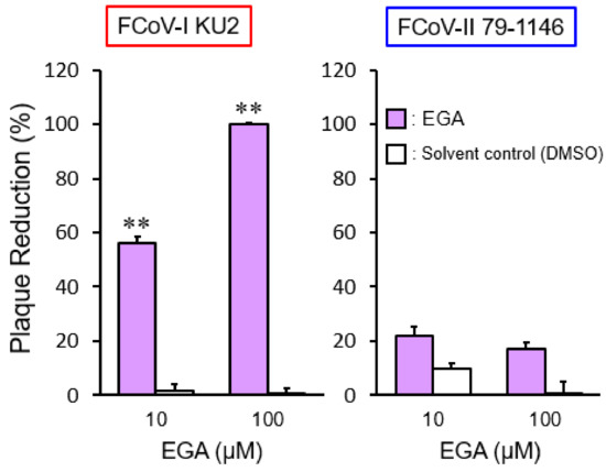 The effects of 4-bromobenzaldehyde N-(2,6-dimethylphenyl) semicarbazone (EGA), which specifically inhibits transport from early to late endosomes, on FCoV infection. **, p < 0.01 vs. each solvent control. Data represent four independent experiments.