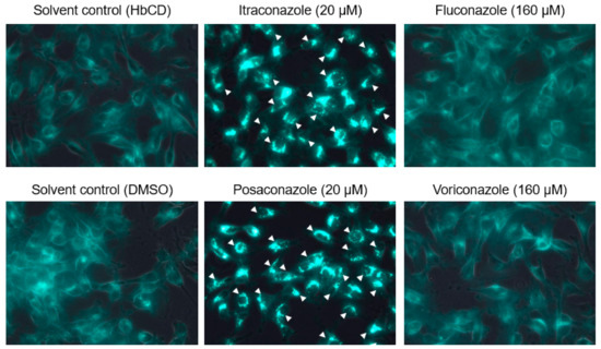 Accumulation of intracellular cholesterol in fcwf-4 cells pretreated with triazole antifungals. The arrowheads point to the cells with accumulated intracellular cholesterol.