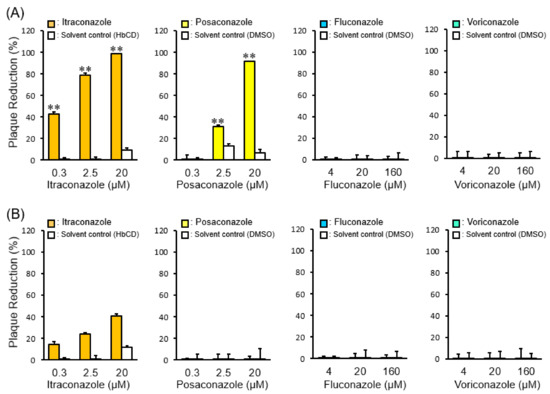The effects of triazole antifungals on FCoV infection. (A) Plaque reduction in type I FCoV-infected fcwf-4 cells treated with different concentrations of triazole antifungals. **, p < 0.01 vs. each solvent control. Data represent four independent experiments. (B) Plaque reduction in type II FCoV-infected fcwf-4 cells treated with different concentrations of triazole antifungals. Data represent four independent experiments.