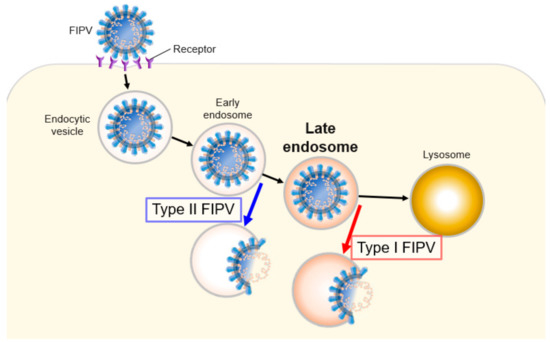 FCoVs attach to the cell surface through feline aminopeptidase N (fAPN) as the viral receptor. FCoVs enter the cell through endocytosis after attachment to the fAPN [6]. It is speculated that low endosomal pH triggers the conformation change of the spike protein of FCoV that releases the virus from the endosome to the cytosol. However, the timing of cytosol entry of each serotype was unclear.