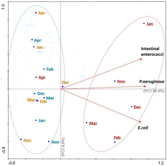 Prior to statistical analysis, and to minimize the dominant effect of exceptional counts, enumerations of intestinal enterococci, E. coli, and P. aeruginosa were changed to log (x + 1) [43]. To evaluate the strength of the correlations between P. aeruginosa and intestinal enterococci, and between P. aeruginosa and E. coli, Pearson’s correlation coefficients (r) were determined [44]. All calculations were performed with IBM® SPSS® Statistics version 26 software (Copyright IBM Corp. © 1989–2019, Armonk, New York 10504-1722, USA). Results were considered significant at p-value ≤ 0.05. In addition, in order to identify patterns in the relation between intestinal enterococci, E. coli, and P. aeruginosa and the sampling sites, principal component analysis (PCA) was performed with CANOCO version 4.5 package (Copyright Petr Smilauer © 2012–2019, Ithaca, New York 14850, USA) [45]. This multivariate technique was used to identify the components (that is, the core variables) that explain the correlations within the measured data. Therefore, by means of PCA, it was possible to achieve associations between variables, reducing the dimension of the original data. The information provided by the principal components highlight the most meaningful parameters, describing the whole data matrix and affording data reduction with minimum loss of original information. Through a linear combination analysis, the positions of original variables in the diagram represent their relevantly interrelations. Thus, principal components effectively represent the original measured data. As a result, if the variables are closely positioned, their correlation is strong and positive. In contrast, if the variables are in an opposite position, then those variables are negatively correlated. Hence, graphical representation of PCA, which plots simultaneously the objects and the variables, is very useful to detect possible associations between variables and objects. Moreover, the association between objects and variables can be determined depending on their relationship and proximity within each group. In this study, PCA was executed to assess distribution patterns based on the parameters under study (P. aeruginosa, E. coli, intestinal enterococci) and the month-spot sampling. Although the results for the first two components (PC1 and PC2) were presented, the others were also analysed.