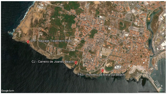Water samples (1 litre) were collected during low tide, approximately 30 cm below the water level, at three sampling sites in Peniche south coast (Portugal) for six consecutive months: November, December, January, February, March, and April. The first site was chosen because of its close proximity with the sewage treatment plant runoff (STP; 39.358447°, −9.405446°). To understand if there is contamination and this is scattered through the currents along the south coast, two more spots were chosen: beach 1—Carreiro de Joanes beach (CJ; 39.354758°, −9.394529°); and beach 2—Portinho da Areia Sul beach (PAS; 39.353452°, −9388739°), approximately 1.03 km and 1.55 km southeast from STP, respectively (Figure 4). A total of 54 samples (Table 1) were duly packed in thermal bags and transported to the laboratory. Samples were analysed within 6 hours of completion.