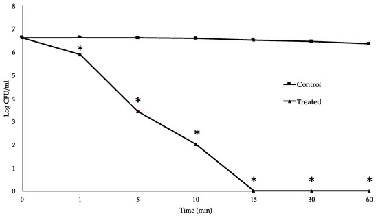 To determine the killing kinetics of clove oil against MDR S. suis, survival of the MNCM06 isolate was evaluated over a 24 h period in the presence of clove oil at MBC. The data on CFU showed that treatment with 0.1% (v/v) essential oil exhibited a strong bactericidal effect on the MNCM06 isolate in a rapid and time-dependent manner. The cell population was reduced by approximately 2-log CFU/mL after only 5 min of incubation. Within 15 min, the bacterial population was completely inactivated (Figure 2, Table S1). Loss of viability was apparent for the MNCM06 isolate after prolonged exposure to the clove oil, while the growth rate was not decreased for the control without clove oil.