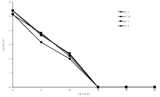 The highest bactericidal activity of clove oil was observed at pH 4. However, the bactericidal effect at the same time of treatment were not significantly different (p > 0.05) among pH values applied (Figure 3, Table S2). The results show that at an MBC of 0.1%, clove oil completely inhibited the tested isolate within 15 min of incubation, with a strong activity at pH 4 through pH 8. The growth of the tested isolate in the control tube without clove oil was unaffected by changes in pH value.
