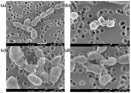 The morphological changes of the treated bacteria were compared with the untreated control, as shown in Figure 4. The cell surface of the untreated MNCM06 isolate was found to have typical morphology, which is an intact spherical shape (Figure 4a). In contrast, the treatment of cells with clove oil for 1 h induced important morphological damage (Figure 4b–d). At the MIC and MBC of clove oil, it was found that cells became deformed, with cell wall ruptures and cell lysis in which leakage of cytoplasmic contents were apparent.