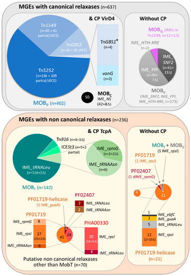 - Guédon, G.; Libante, V.; Coluzzi, C.; Payot, S.; Leblond-Bourget, N. The obscure world of integrative and mobilizable elements, highly widespread elements that pirate bacterial conjugative systems. Genes 2017, 8, 337. [Google Scholar] [CrossRef] [PubMed]