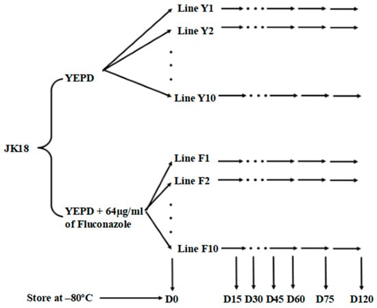 To establish experimental evolution lines, a stock culture of strain JK18 from −80 °C freezer was first streaked onto the rich yeast extract-peptone-dextrose (YEPD) agar and incubated at 37 °C for two days. A single colony from the plate was then used to streak for ten independent experimental evolution lines on YEPD agar and another ten independent lines on YEPD agar + 64 µg/mL of fluconazole. The plates were incubated at 37 °C for three days. By the end of the third day, the cells increase from 1 cell to approximately ~106 cells, accounting for about 20 mitotic divisions. Every three days, the transfer within each line was made by streaking a random colony to a new plate, and the plates were incubated at 37 °C. The experimental evolution was completed over 120 days. Cells on days 15, 30, 45, 60, 75, and 120 were collected and stored in 20% glycerol in −80 °C freezer. These cells corresponded to approximately 100, 200, 300, 400, 500, and 800 mitotic divisions, respectively, after the initial setup (see Figure 1).