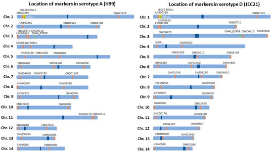 Chromosomal locations of the 33 PCR-RFLP markers used for assaying genotypes in this study. Shown here are the respective positions of the 33 PCR-RFLP markers in two strains H99 and JEC21 representing the two sequenced and annotated genomes serotype A and serotype D genomes, respectively. Markers CNA00290 and CNA07470 on chromosome 1 flank the fluconazole target gene ERG11 while marker CNN02060 on chromosome 14 is located close to a fluconazole QTL. CNAG_02959 is the marker used as an endogenous reference control for qPCR and is located on Chromosome 3. Dark blue indicates the location of the centromeres.