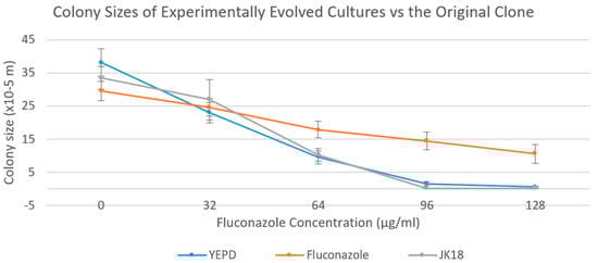 Xu et al. determined that MIC of fluconazole can be determined by measuring colony size as a method of quantification [13]. Since the mutation accumulation lines were maintained on solid agar media, we further investigated the growth of the evolved cultures on agar medium supplemented with various concentrations of fluconazole. Here, colony size was used as a proxy for vegetative growth rate on solid medium, with a bigger colony reflecting more growth. Figure 3 shows the mean colony sizes of the evolved lines after 40 transfers at five fluconazole concentrations (0, 32, 64, 96, and 128 µg/mL). Our results demonstrated that, on average, the Y-series lines were similar to the original clone of JK18 in the growth pattern, starting with a relatively large colony size of around 37 × 10−5 m in diameter at 0 µg/mL of fluconazole before rapidly decreasing with increasing fluconazole concentration. At 96 µg/mL of fluconazole, there was almost no growth for most of the evolved clones (except the Y10 line), with the mean colony size approaching zero. In comparison, the colony sizes for cultures evolved under fluconazole stress were initially smaller, with a mean diameter around 29 × 10−5 m. However, the decrease in colony size of the F-series cultures at increasing fluconazole concentrations was smaller than those of the Y-series cultures, with noticeable growth at 128 µg/mL of fluconazole for all the F-series lines (Figure 3). Supplementary Figure S1A,B show the colony sizes of individual Y-series lines and F-series lines, respectively. As shown in Figure S1, the growth pattern of line Y10 was similar to those of the F-series lines.