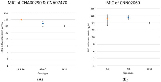 Relationships between fluconazole MIC and genotypes at two loci on Chromosome 1 (Figure 4A) and one locus on Chromosome 14 for cultures on Day 120 (Figure 4B). The MIC for each genotype was determined by ten replicates each for genotypes AD and A compared to the original strain JK18. This was determined as the minimal concentration of fluconazole on which there were no colonies observed. Based on an unpaired t-test, there was a significant difference between A and AD in the two loci on Chromosome 1 (p < 0.0001) but no significant difference between A and AD in CNN02050 (p = 0.4527). All replicates with genotype A in CNA00290 and CNA07470 had the same MIC.